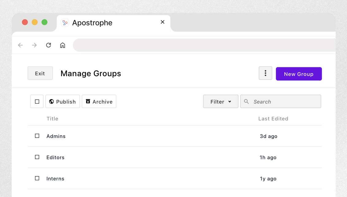 Effective content management relies on the ability to control who can access, edit, and publish content. This is why ApostropheCMS comes with a role-based permission system.