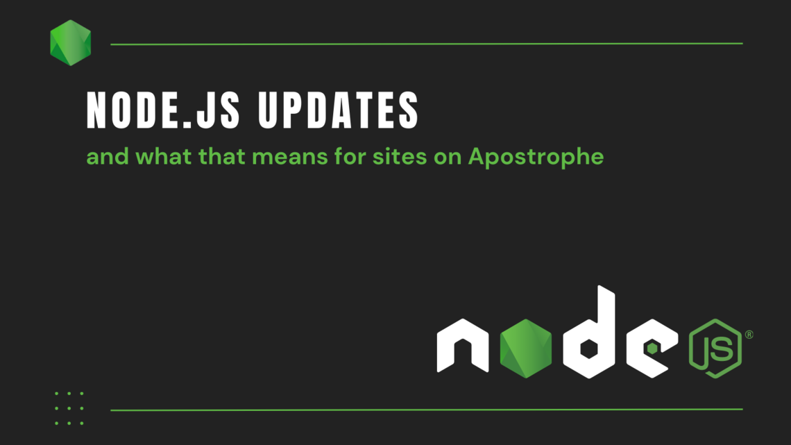 It is important to understand what version of Node.js your Apostrophe project is running on, as there are recent updates shared by the platform that may impact your site. Older versions of Node.js are reaching its end-of-life date on April 30, 2023. If you’re a developer working on Apostrophe or are an organization working with an external agency or development team, they might already be aware of this and may have reached out about upgrading to Node 18.